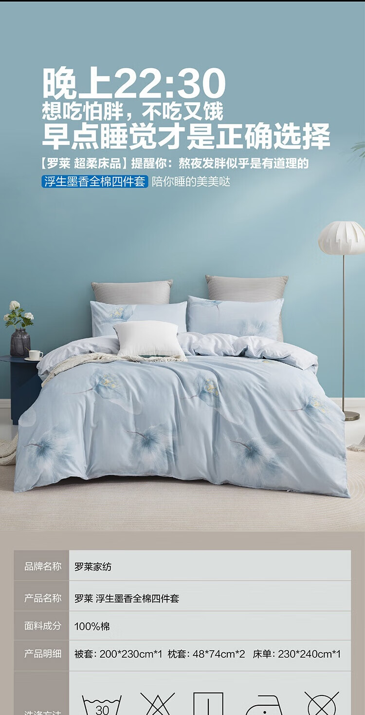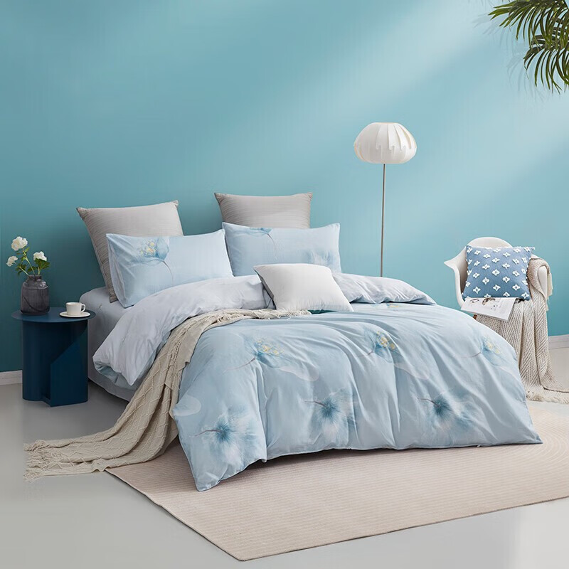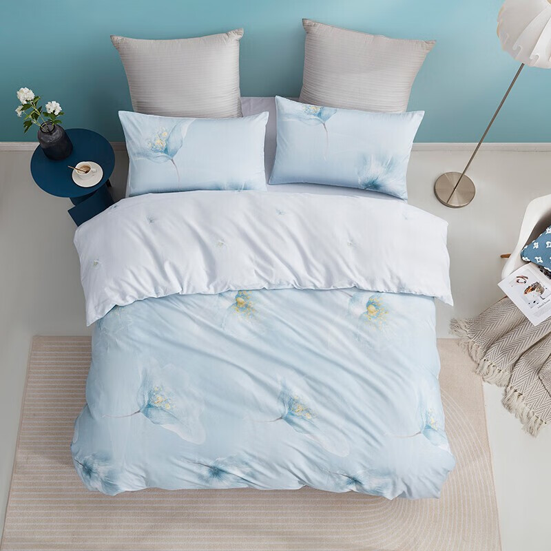 ● 水墨晕染:被套上散落的海棠花朵,象征着高洁,美丽,真挚的爱,在花型的塑造上,采用了水墨画法,海棠花呈现出轻灵飘逸的姿态。